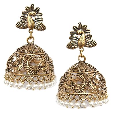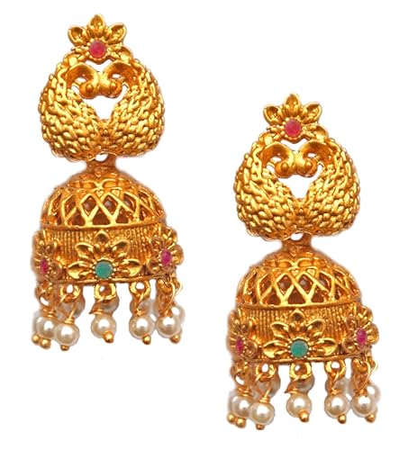 Saizen Traditional Gold Pearl Peacock Kundan Jhumkas Diamond Pearl Alloy Jhumki Earring