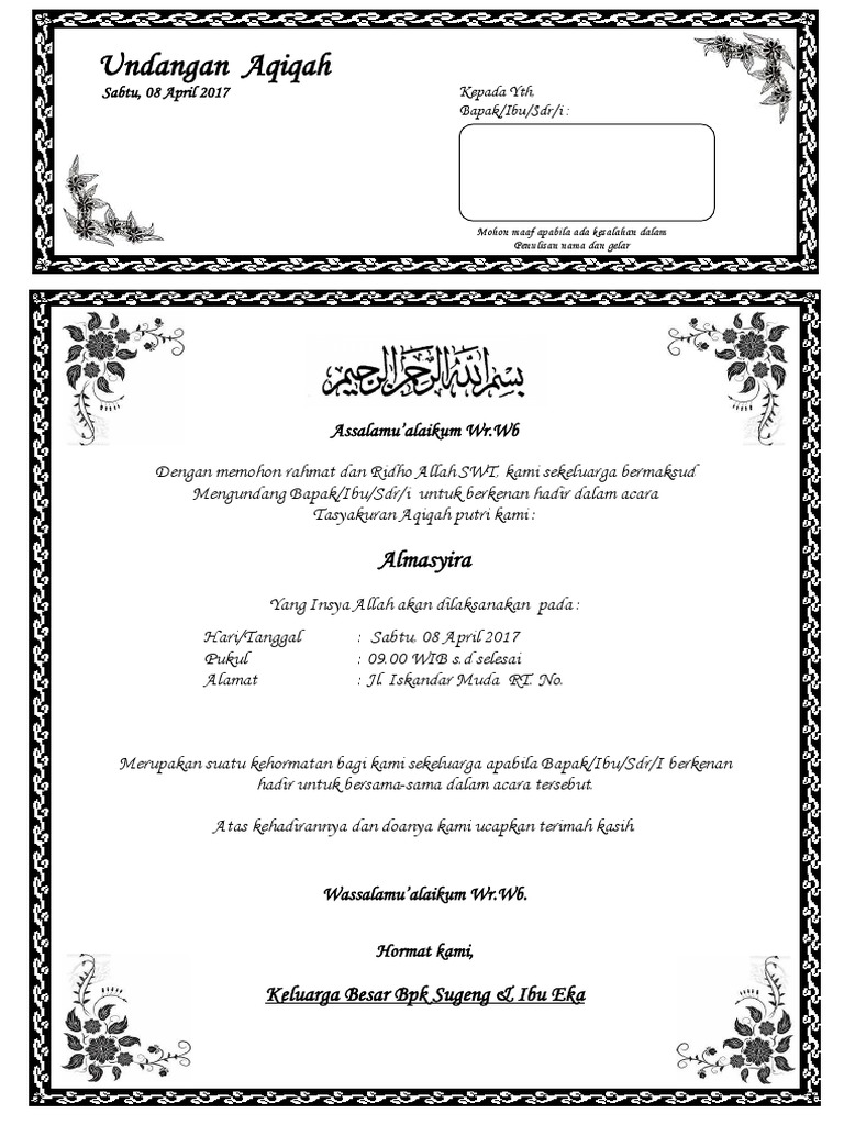 Link download kartu undangan acara aqiqah 01 format ms word hitam putih. Semoga anak yang di anugerahkan bisa menjadi anak yang baik dan berbakti kepada kedua orang tua. Itulah contoh undangan aqiqahan semoga mempermudah sekaligus menambah referensi untuk anda yang baru mempunyai anak.