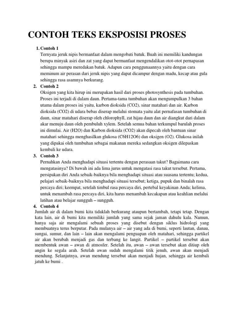 Karangan eksposisi memiliki beberapa jenis. Contoh teks eksposisi proses beserta strukturnya pengertian teks eksposisi teks eksposisi adalah teks yang berisi tentang sebuah informasi yang dapat berupa gagasan pendapat maupun fakta dengan tujuan untuk dapat memberikan sebuah informasi dan juga pengetahuan kepada pembaca mengenai suatu hal. Paragraf 1 oksigen yang kita hirup ini merupakan hasil dari proses photosynthesis pada tumbuhan.