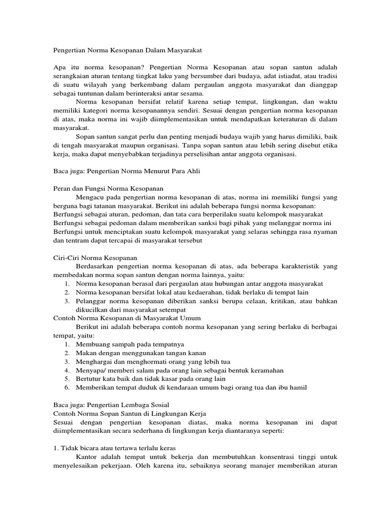 Norma Kesopanan Dalam Masyarakat Pengertian Dan Contohnya