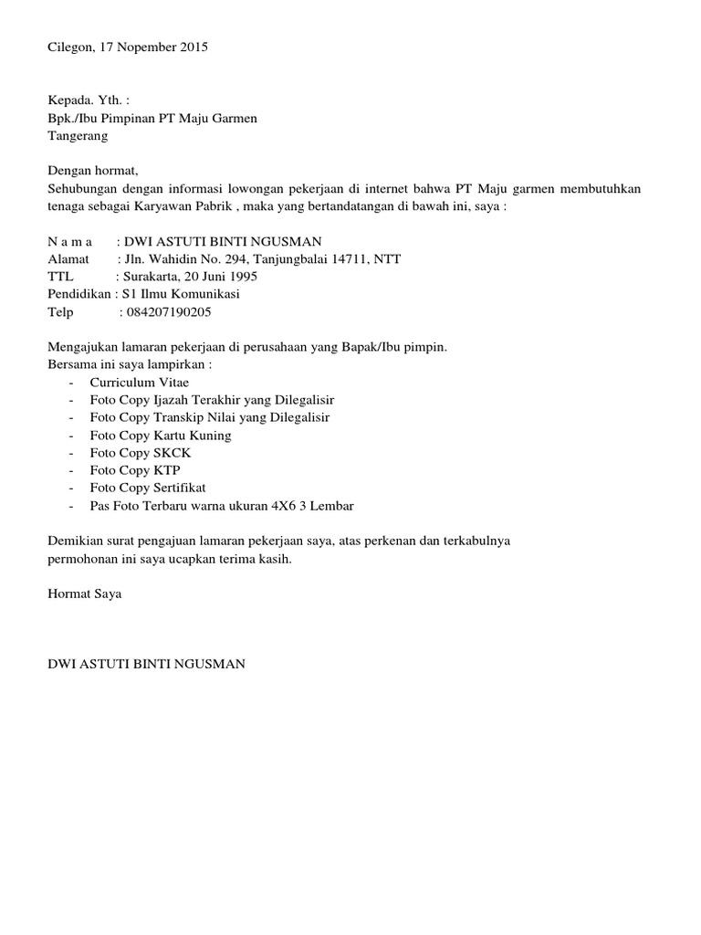 Contoh Surat Lamaran Kerja Garmen Gawe Cv